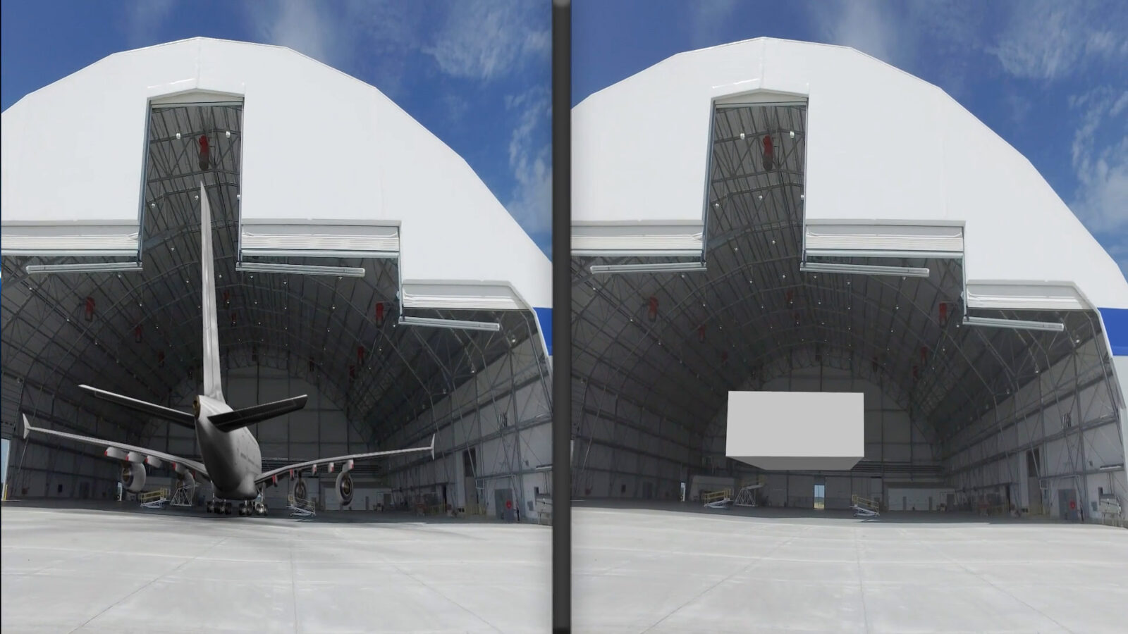 Actual airplane hangar, with CG created jet in the hangar.